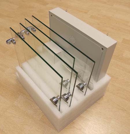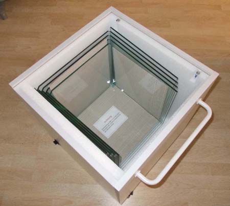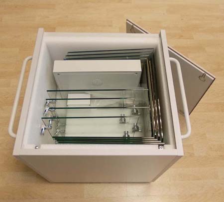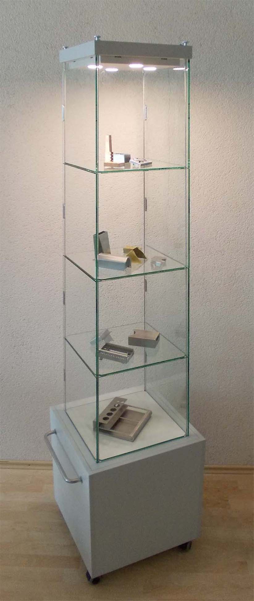 Die einzelnen Glassegmente können auf Grund ihrer Form ineinander im Vitrinensockel verstaut werden. Der Vitrinensockel dient gleichzeitig als Transportkiste, sodass die komplette Vitrine platzsparend untergebracht und sicher transportiert werden kann.